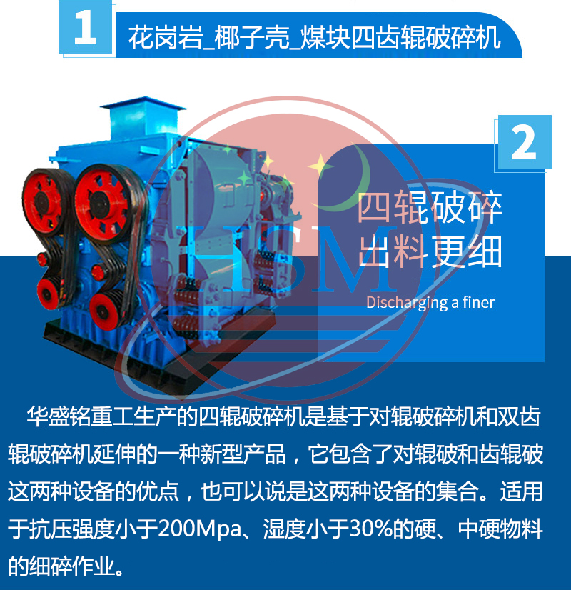 四輥破碎機物料進入上面兩輥V型破碎腔以后,受到上兩輥相對旋轉的擠壓力作用,將物料擠軋和嚙磨后再進入相對旋轉的中間兩輥,利用中間兩輥的擠壓力進行二次擠軋和細破后,然后進入下兩輥破碎成需要的粒度由輸送設備送出。