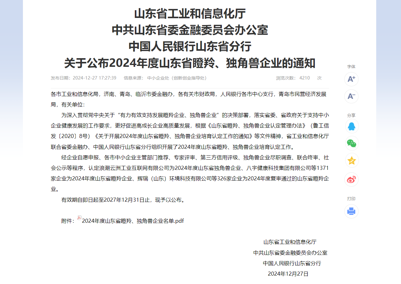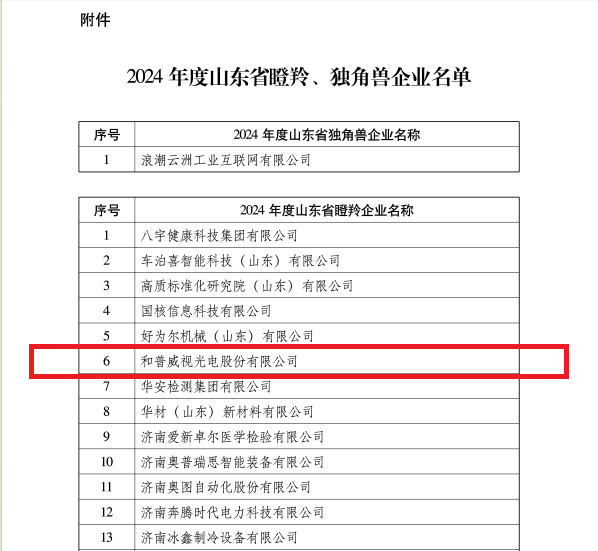 近日,山東省工業和信息化廳、中共山東省委金融委員會辦公室、中國人民銀行山東省分行公布2024年度山東省瞪羚、獨角獸企業名單。和普威視成功入選。